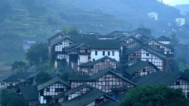 12月19日、明け方の四川省合江県福宝鎮。四川省瀘州市合江県福宝鎮は四川・重慶・貴州の境の大漕河のほとりにある。元朝元年に建設され、保存状態が良好な明清の吊脚楼が山沿いに並び、「四川省農村部の民家の生きた化石」と称されている。