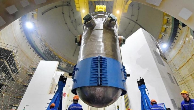 1月28日、福清原子力発電所5号機原子炉の圧力容器を吊り下げて設置する様子