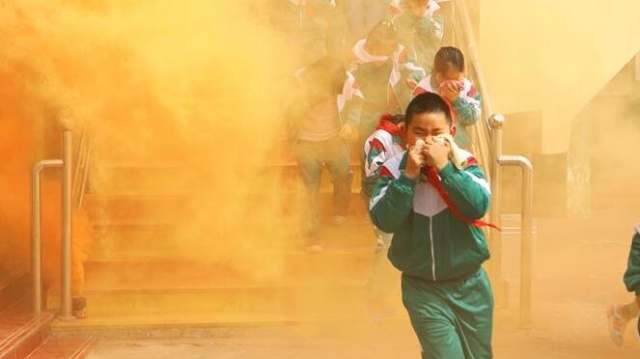 3月26日、消防訓練で避難する山西省運城市の人民路学校の学生。全国小中学生安全教育日にあたる同日、各地で安全知識を普及させ学生の安全意識を高める様々な活動が行われた。