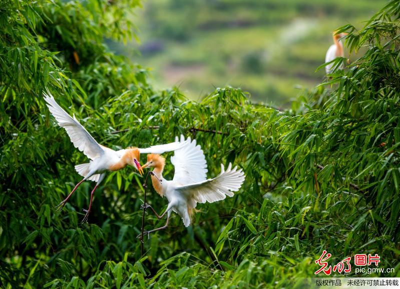 重慶市豊都県十直鎮上壩村は3本の川が交わる地点に位置し、近年の環境整備の強化により魚類が増加し、水質が改善され、大量の鳥類が生息するようになっている。中でもシラサギの生息数は1000羽に上り、竹林の中で舞うシラサギは大自然の美しい風景となっている。