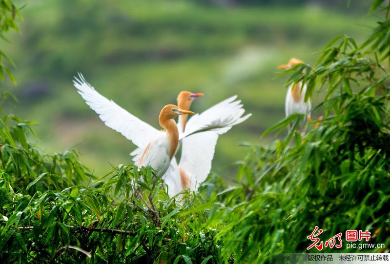 重慶市豊都県十直鎮上壩村は3本の川が交わる地点に位置し、近年の環境整備の強化により魚類が増加し、水質が改善され、大量の鳥類が生息するようになっている。中でもシラサギの生息数は1000羽に上り、竹林の中で舞うシラサギは大自然の美しい風景となっている。