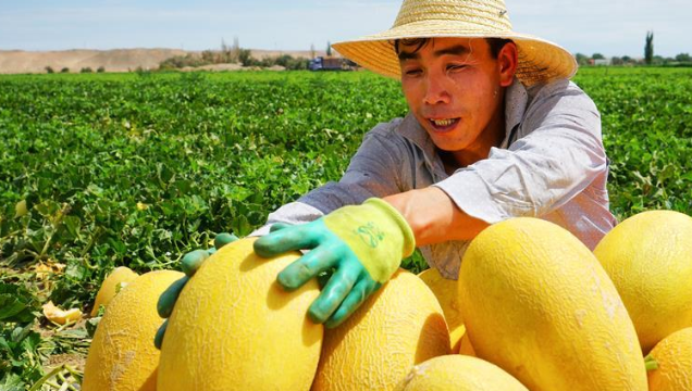 6月27日、新疆ウイグル自治区ハミ市伊州区南湖郷でハミウリを選別する農家。新疆ウイグル自治区ハミ市伊州区南湖郷で1万ムーにわたりハミウリが熟し、多くの業者が買い付けに訪れている。