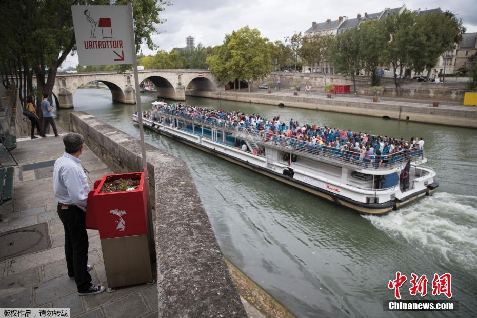 8月13日、フランス・パリの街中にある公共小便器「uritrottoir」。パリはこのほど、公共エリアに小便器「uritrottoir」を試験導入した。この便器は無臭で、生態保護を目的としている。赤い部分が小便器になっており、その上に植物が生え、下のボックスに藁やおがくずが入っている。