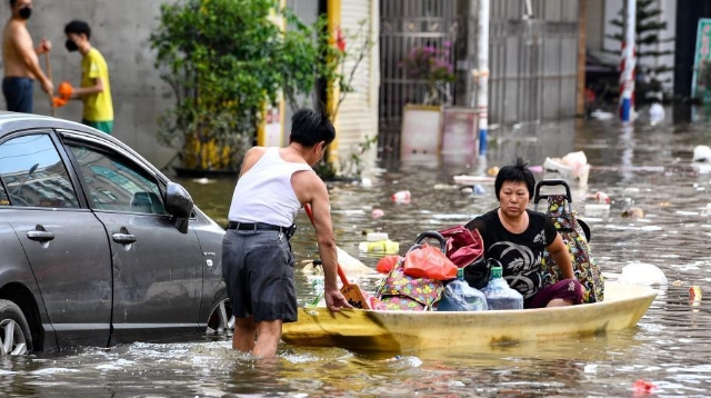 9月3日、広東省汕頭市瓦窯村で、家に溜まった水を片付ける住民。同日、広東汕頭市潮南区は天気が回復し、水害発生地域の浸水も徐々に引いた。