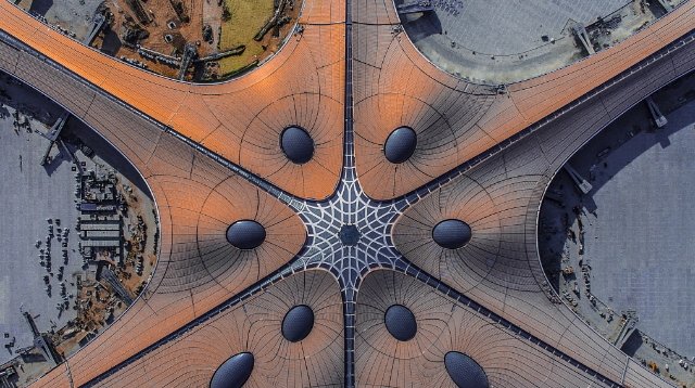 北京大興国際空港の工事現場を空撮 現代的なデザイン