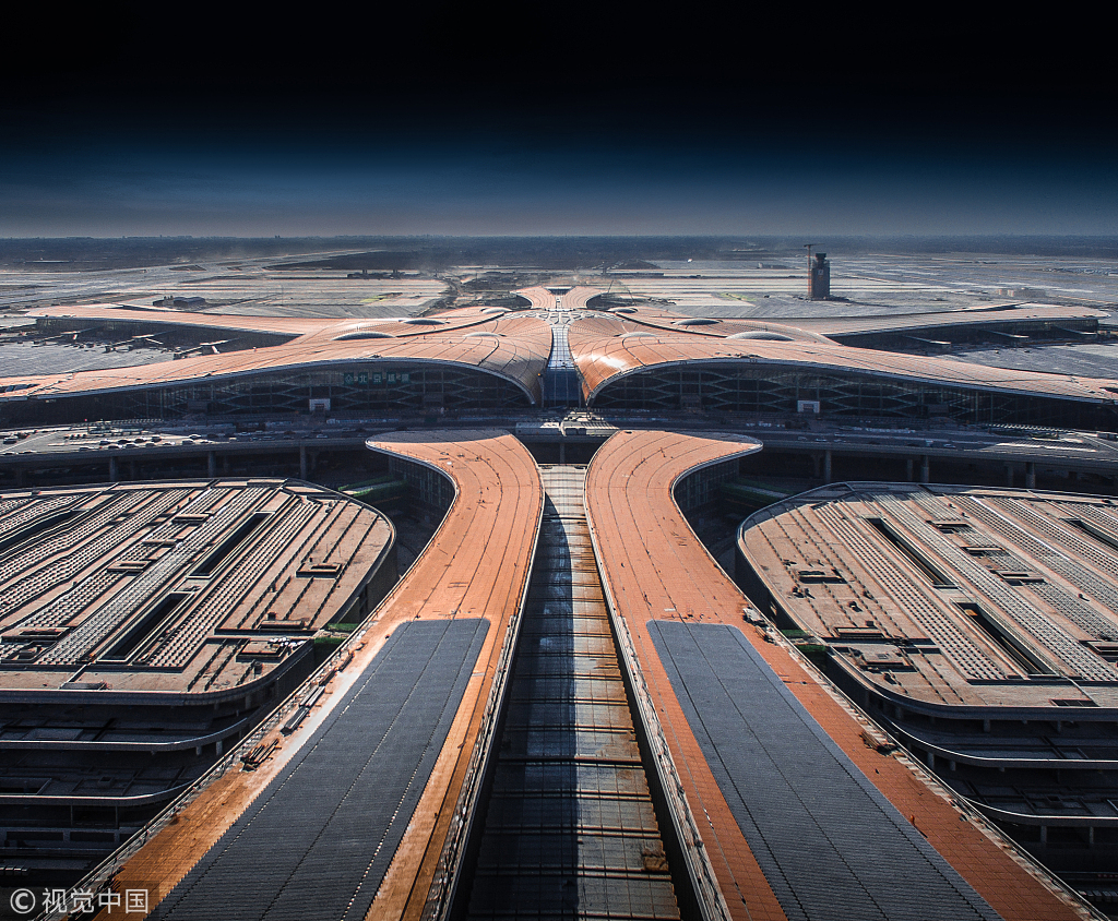 1月5日、北京大興国際空港の工事現場。主体ビルは非常に現代的なデザインである。