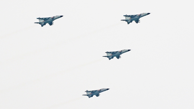 山東省煙台市で2月26日、海軍航空兵のJH-7「飛豹」戦闘機が低空編隊飛行訓練を実施した。