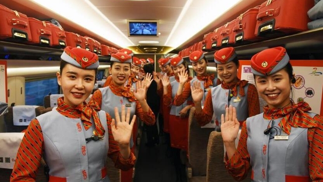 11月24日、「高速鉄道斉魯周遊」体験列車から手を振って挨拶する乗務員