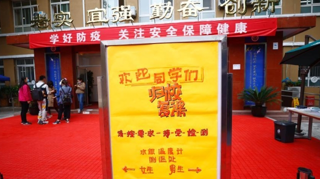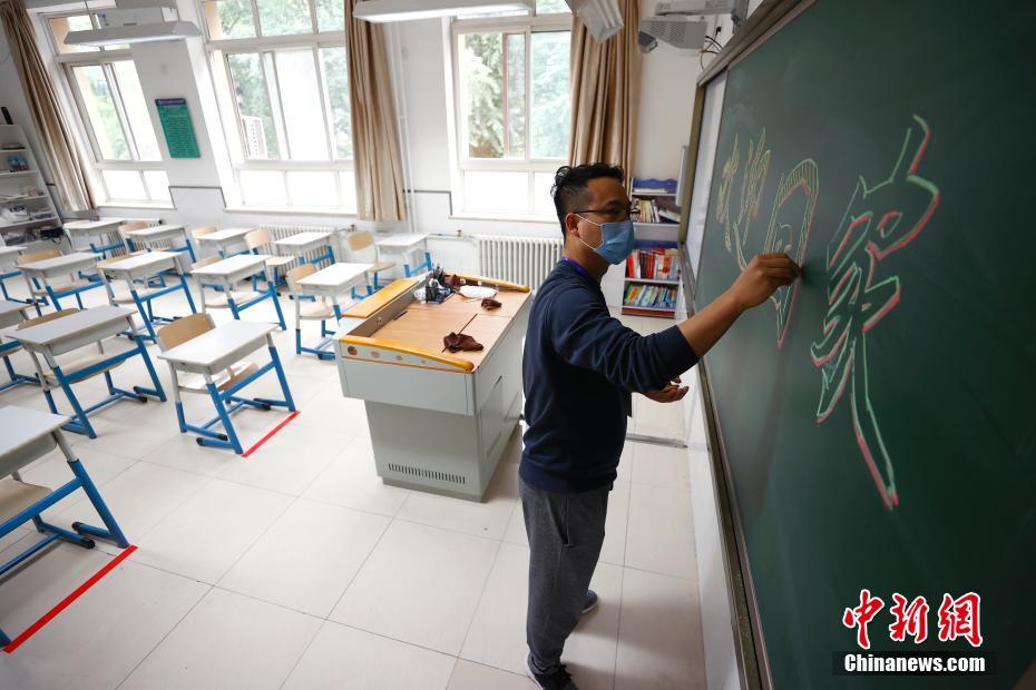 5月8日、黒板に「歓迎回家」(おかえり)と書いて学校に戻る中学3年生を迎える北京市陳経綸中学校(本部中学)の美術老師。北京市の8万4200人以上の中学3年生が5月11日に学校に戻る。