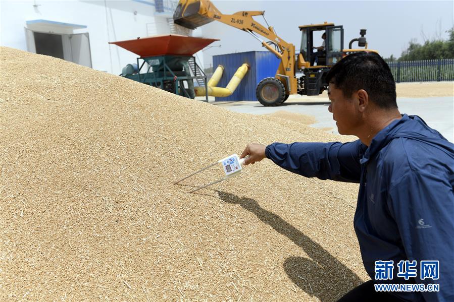 6月13日、収穫した小麦の水分を測る魏徳東さん