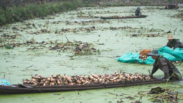 湖北省はレンコンの収穫シーズンを迎え、レンコン農家が収穫作業を慌ただしく行っている。