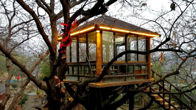 山東省蒙陰県桃墟鎮安康村のツリーハウス(12月5日、携帯電話で撮影)