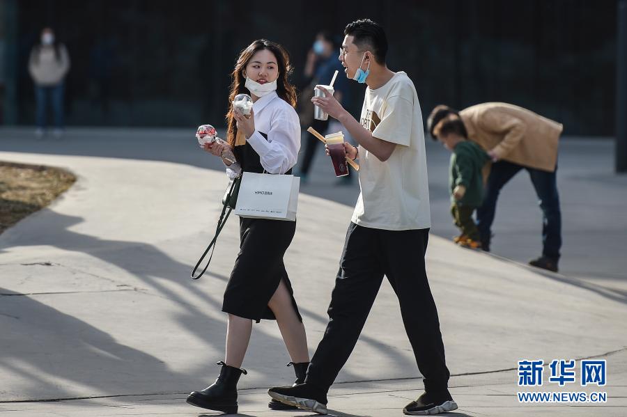2月21日、北京市大興区亦荘鎮の大族広場を歩く市民。同日、北京市の気温は20度に達した。