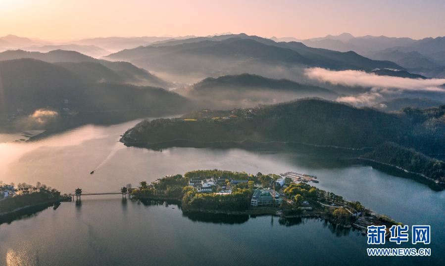 初春の空は青く、安康ダム区の漢江の静けさを際立たせる。周辺の山々が水に浸かり、半分は水面、半分は水中にある。水色の色とりどりに光る様子が幻想的である。