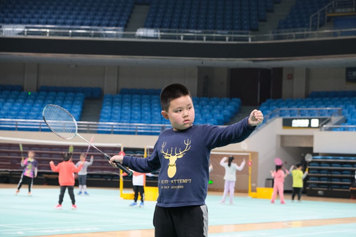 人々が3日、武漢洪山体育館でバドミントンの練習を行った。