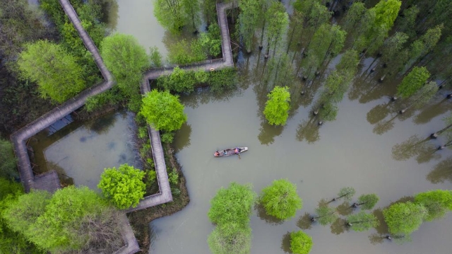 杭州市臨安区青山湖国家森林公園で15日、作業員が船で湖を巡回した(ドローンで撮影)。