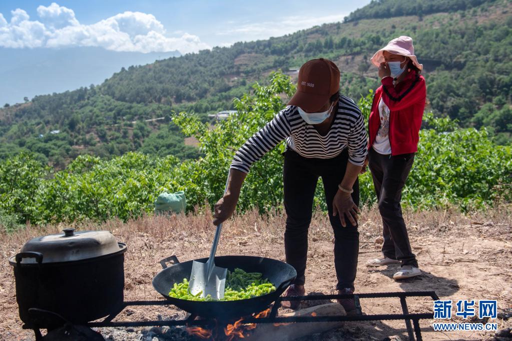 5月24日、雲南省漾濞県蒼山西鎮秀嶺村大地埂組陳家村の避難所で、野菜を炒める被災者