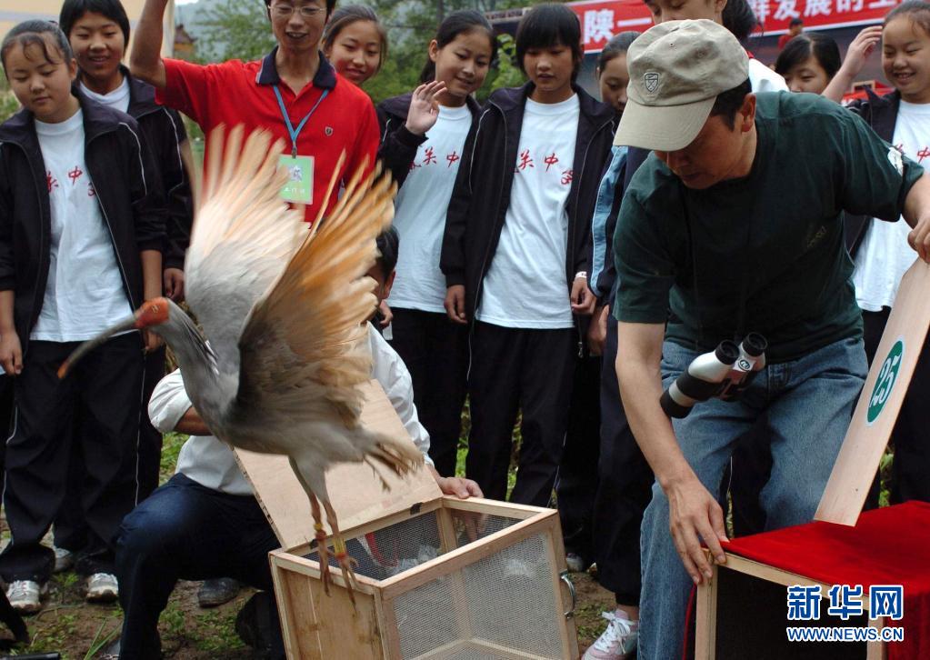 秦嶺の奥地にある陝西省寧陝県城関鎮寨溝村で、トキを放つ2人の専門家。人工繁殖・飼育したトキを自然に帰したのは中国初だった(2007年5月31日)