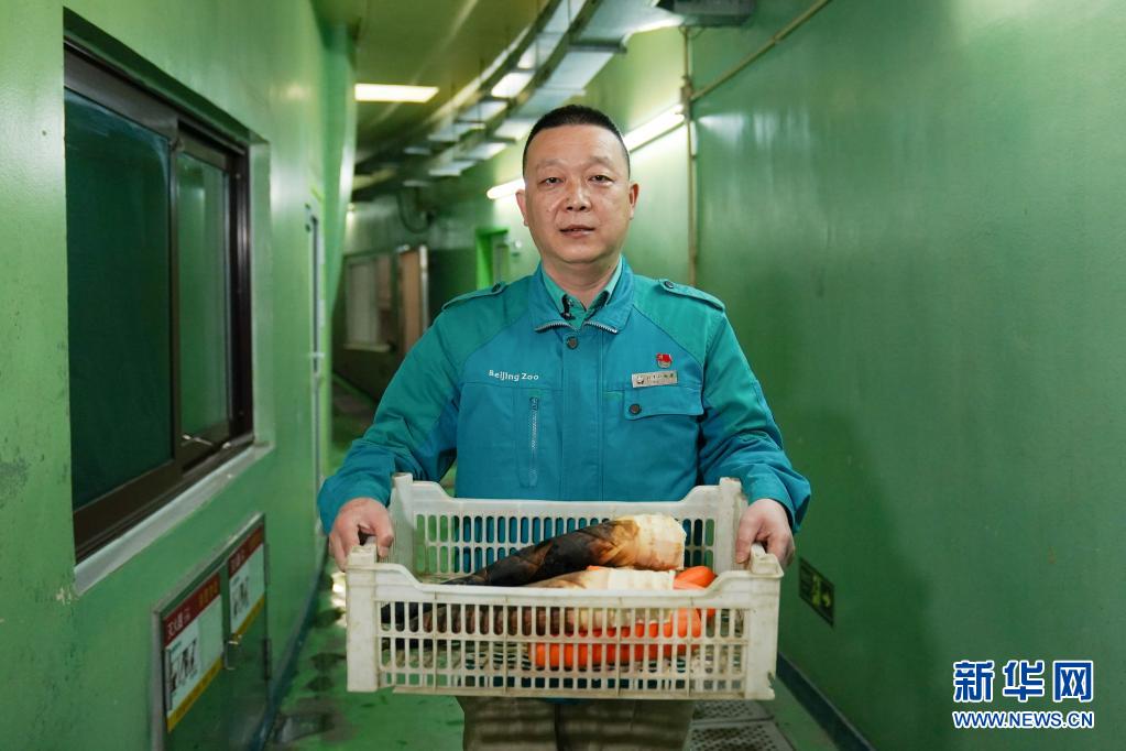 北京動物園のパンダ館で、パンダに与える食べ物を持つ馬濤さん(4月21日)
