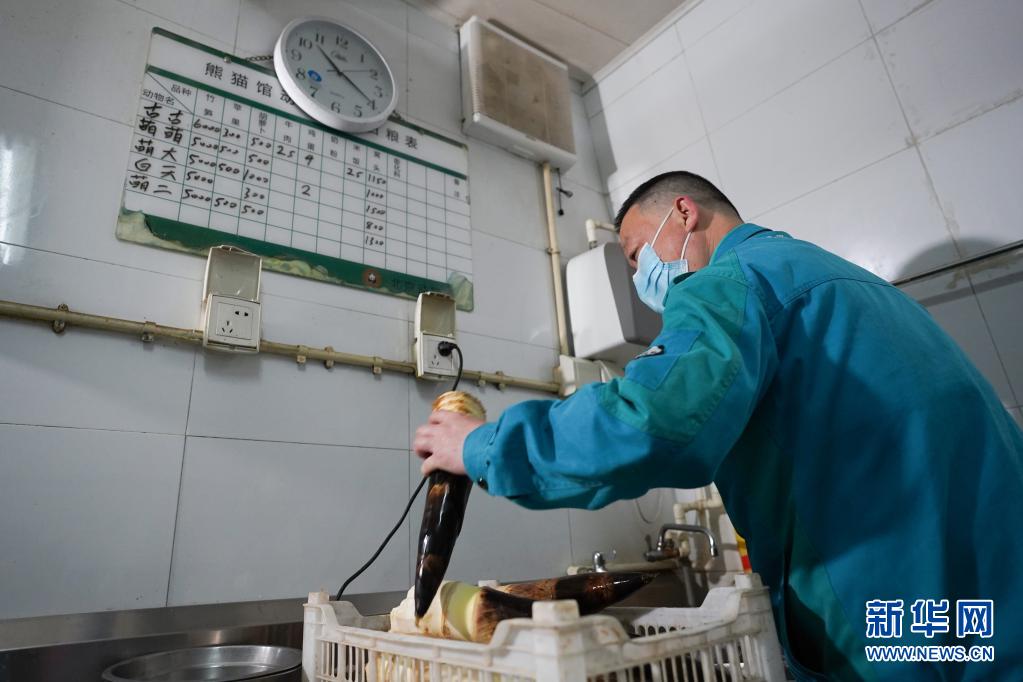 北京動物園のパンダ館で、パンダの「萌二」に与えるタケノコなどの食べ物を用意する馬濤さん