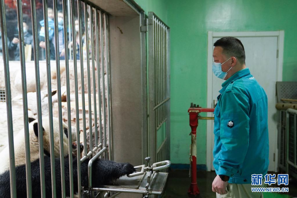 パンダの「萌二」の食事状況を観察する馬濤さん