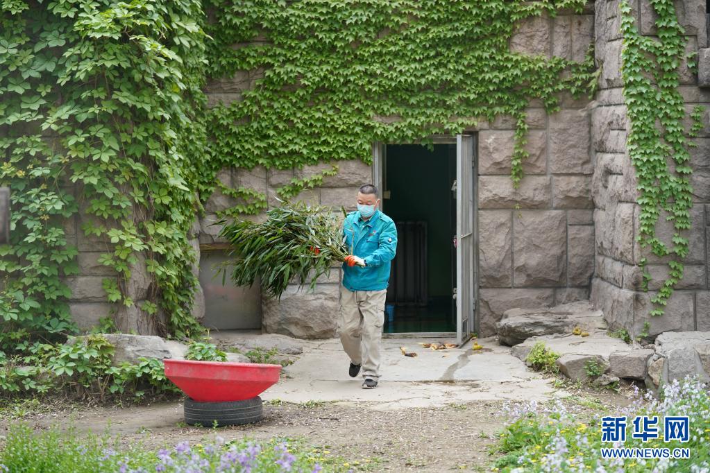 パンダの「萌萌」が食べる新鮮な竹を置く馬濤さん