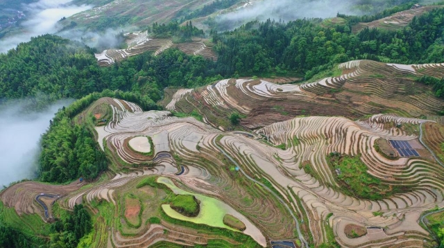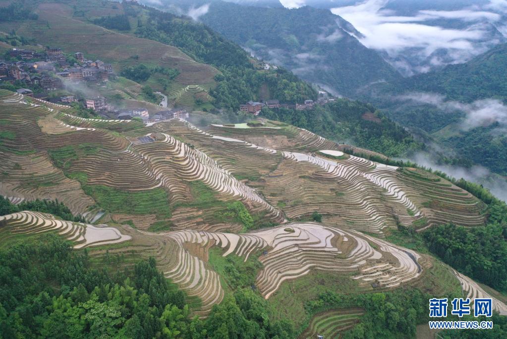 初夏、広西チワン族自治区龍勝各族自治県の龍脊棚田は2000ムー以上にわたり棚田が層になり、美しい風景が広がっている。