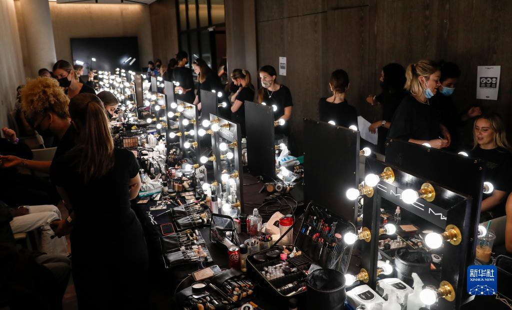 9月21日、イギリスのロンドン・ファッションウィークのステージ裏で、リチャードクインのショーの準備をするモデルとスタイリスト