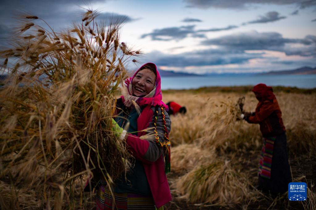 西蔵(チベット)自治区那曲市尼碼県文部郷文部南村の村人が同日、ハダカムギを収穫した。文部郷文部南村は当惹雍措(タンラ・ユムツォ)の湖畔に位置し、標高は4645メートル。現地の村人は「半農半牧」を中心とし、蔵北高原で独自色を持つ。文部郷の一帯は自然環境が独特で、牧畜地区を中心とする西蔵北部で珍しい畑を作った。