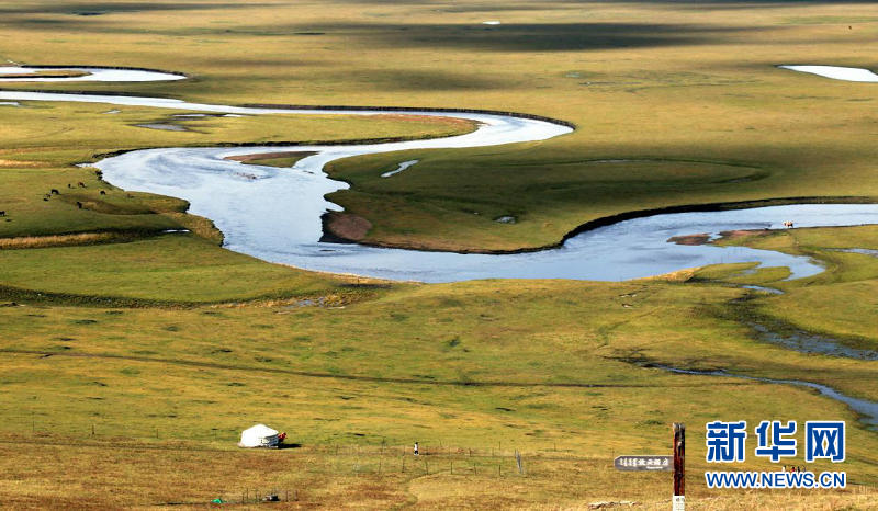 秋になり、内蒙古自治区のフルンボイル大草原の草は黄色に変わり、「天下第一曲河」と称される莫日格勒河が黄と緑が混ざった草原を流れている。