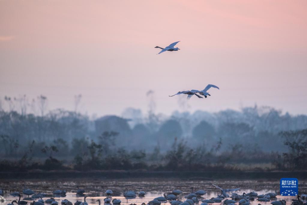 洞庭湖畔にハクチョウが舞う。