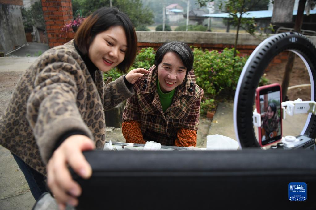 周さん(右)が17日、湖南省永州市零陵区和諧村を訪れ、村人の蒋冬娥さんのためにメイクを施した。