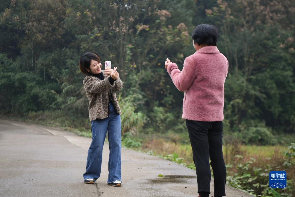 周さん(右)が17日、湖南省永州市零陵区和諧村を訪れ、村人の蒋冬娥さんのためにメイクを施した。