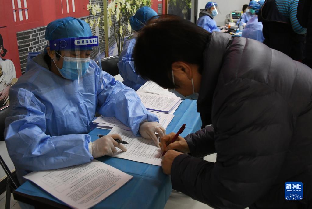 11月29日,在羊坊店街道铁西社区新冠疫苗临时接种点,医护人员(前左)指导社区居民在知情同意书上签字。