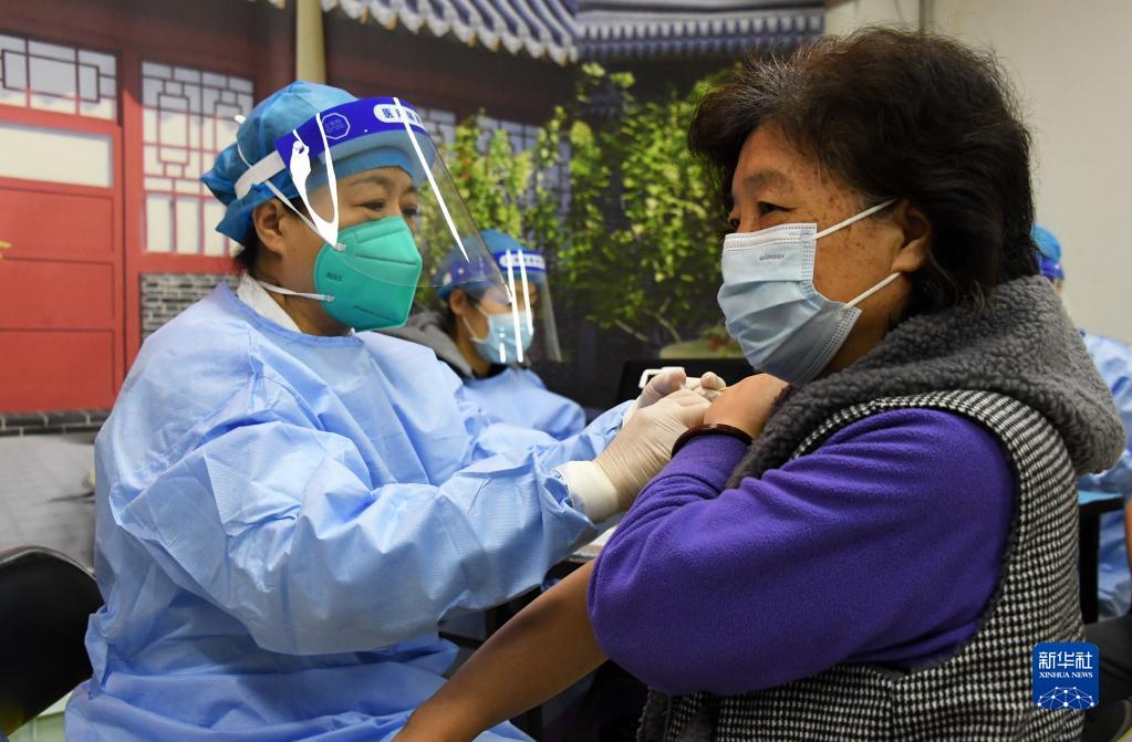 11月29日,在羊坊店街道铁西社区新冠疫苗临时接种点,医护人员(前左)为社区居民接种新冠疫苗加强针。