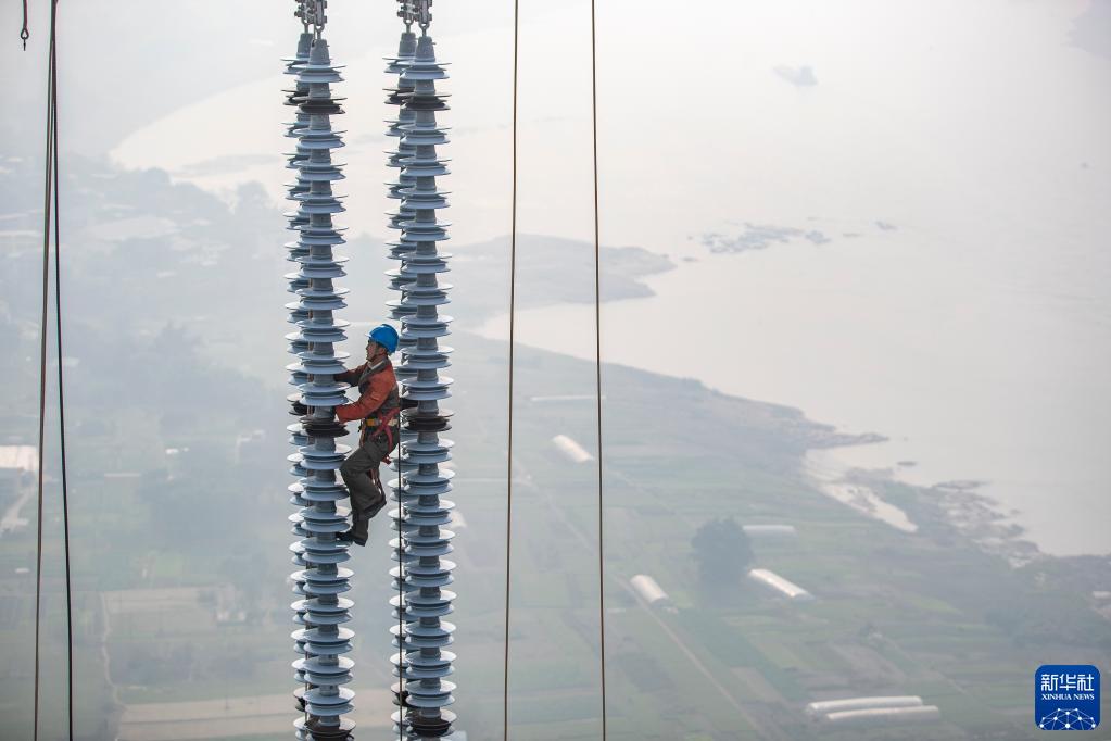12月5日、川を跨ぐ導線に最後のパーツが取り付けられ、中国の「西電東送」(西部地域で発電した電気を東部地域に送電)重点プロジェクト・白鶴灘―江蘇±800キロボルト高圧直流送電プロジェクト(重慶区間)の江津長江線は完成し、2022年の運営開始の基礎を固めた。