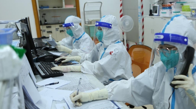 23日、仁済医院南部院区で、重症患者一人一人の治療計画を検討し、患者に合った方針を決める医師と拠点病院の専門家。(上海=新華社記者/金立旺)