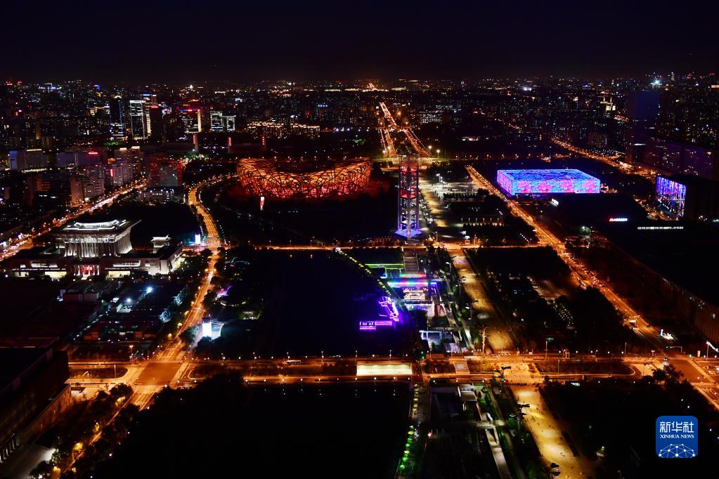 オリンピックデー、北京五輪会場がライトアップ