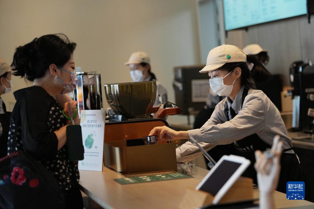 7月4日,在星巴克西安翠华里手语店,听障咖啡师李莎(右)为顾客制作咖啡。