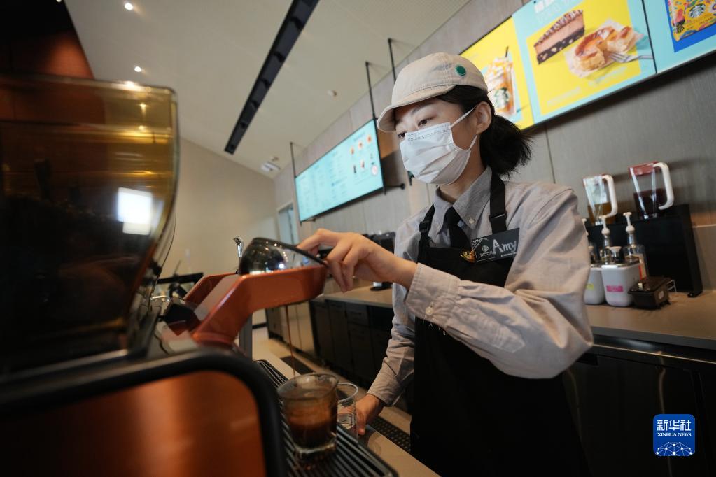 7月4日,在星巴克西安翠华里手语店,听障咖啡师李莎为顾客制作咖啡。
