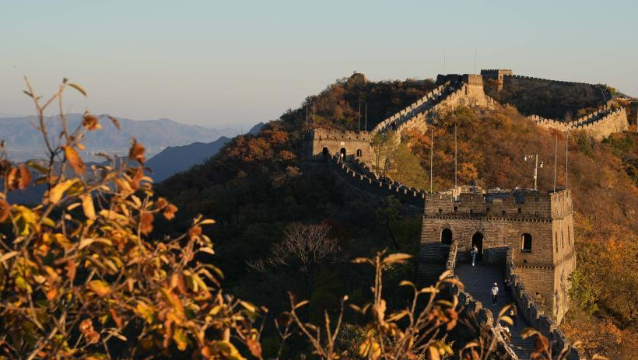 秋になり、北京の慕田峪長城は紅葉し、多くの観光客が見物に訪れている。