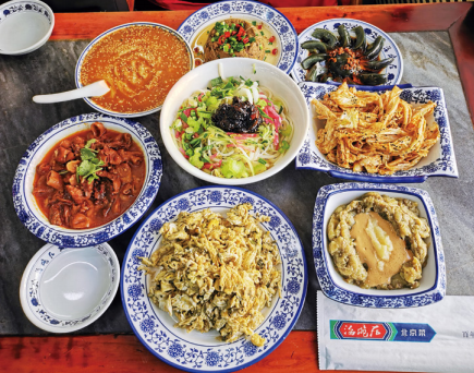 北京の地元料理店にて。中心は炸醤面、その上から時計回りに麻豆腐、松花蛋、乾隆白菜、茄泥、香椿炒鶏蛋、炖吊子、面茶