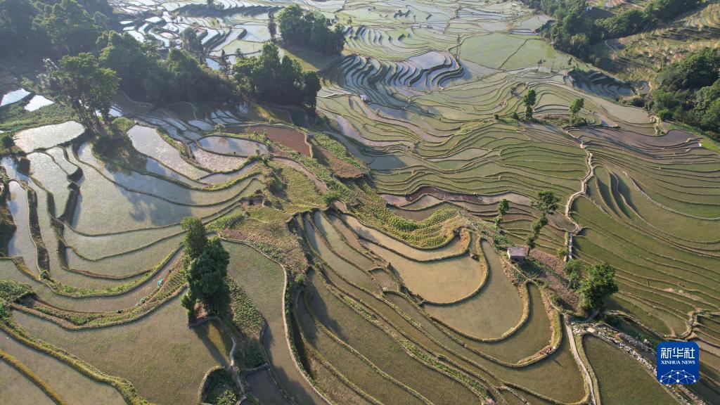 5月7日、ドローンで撮影した元陽県ののハニ棚田中心区にある壩達棚田