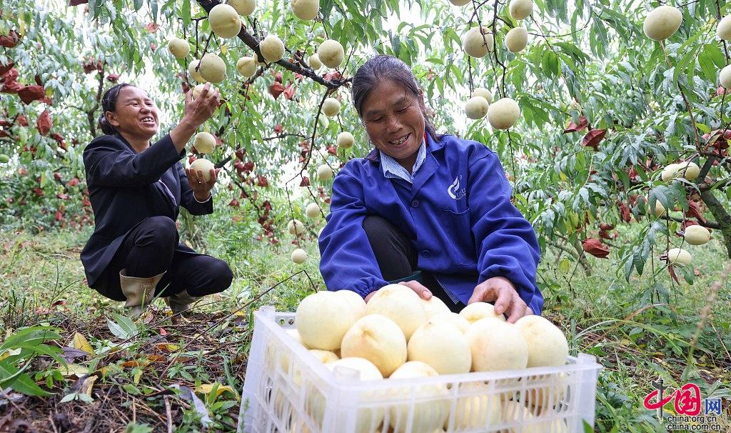 貴州省銅仁市玉屏トン族自治県朱家場鎮混寨村で栽培されているモモが24日、収穫シーズンを迎えた。果物農家は晴天に恵まれているうちに収穫・搬送・包装し、市場に供給している。