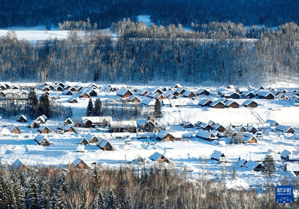 新疆ウイグル自治区阿勒泰地区布爾津県禾木村は連日の降雪で雪景色になった。山嶺、村落、森林が白い雪に覆われ、仙境のような美しさだ。新華社記者李響 撮影