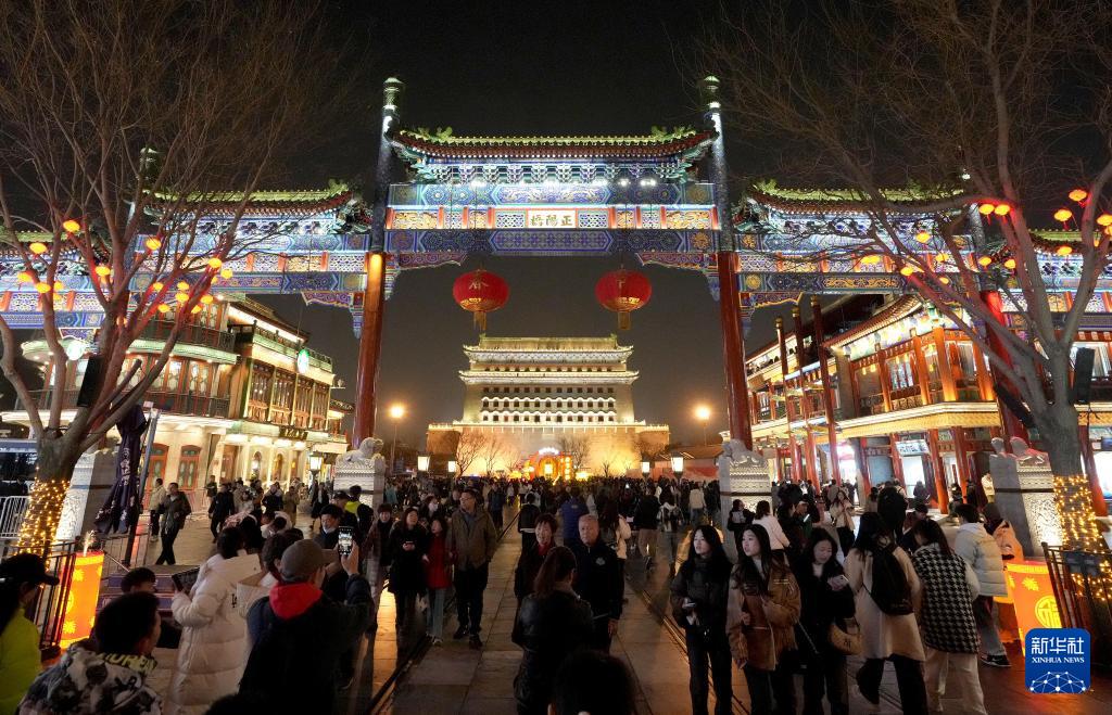 旧暦1月8日にあたる2月17日の夜、北京市の前門大街は明かりが灯り、大勢の市民と観光客が散歩やランタン観賞を楽しみ、春節の雰囲気を味わった。