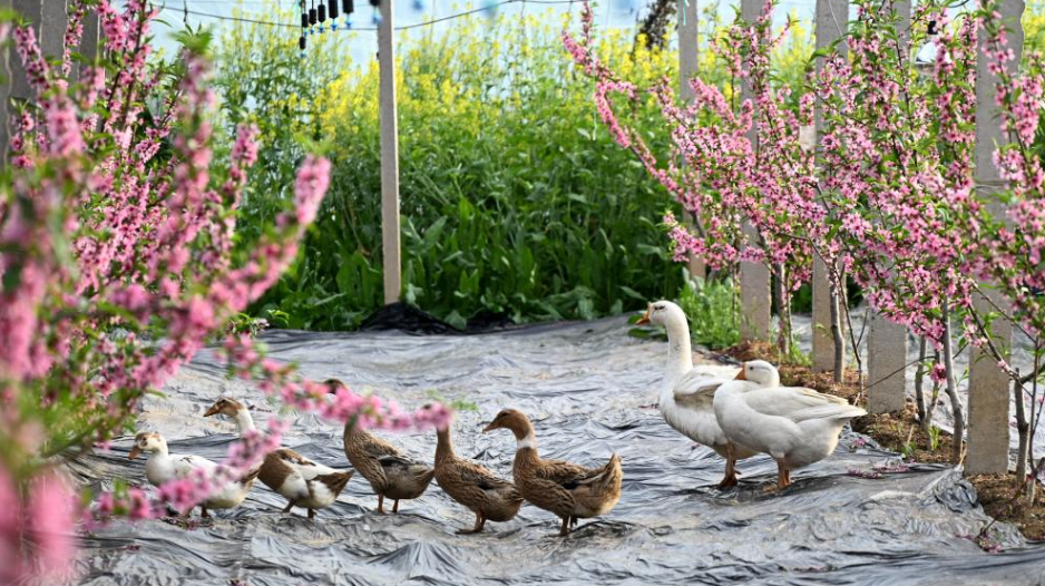 山東省平度市白沙河街道は近年、家畜と果物の共生飼育・栽培技術を普及させ、果樹ハウスで鶏、鴨、ガチョウなどの家畜を飼育している。家畜が草を食べ、虫を捕り、果樹栽培に化学肥料が必要ないという生態の共生効果を生んでいる。