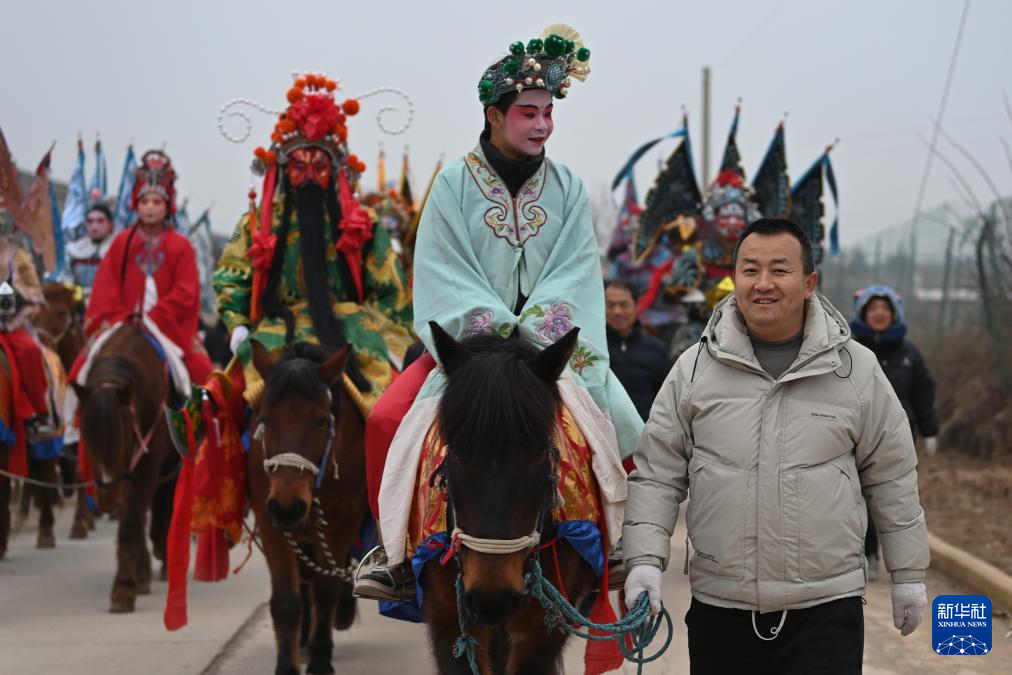 有名な「馬社火村」である隴県東南鎮黄花峪村では毎年春節期間、村民が馬社火パフォーマンスを行い、近隣住民に新春の祝福を贈る。早朝に出発するため、社火隊は通常3時か4時には準備に取り掛かり、演者、メイクアップアーティスト、銅鑼隊、後方スタッフが深夜から早朝まで忙しく動き、協力して新春の文化の宴を作り上げる。