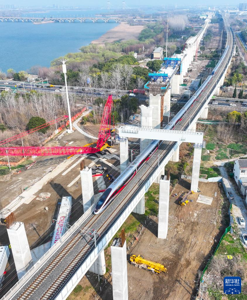 3月6日早朝、中国鉄建大橋局が建設する上海・南京・合肥高速鉄道の通泰揚特大橋の上を通る連鎮高速鉄道の建設現場で、長さ35.28メートル、重量208トンの鋼桁が吊り下げられ、設置場所に正確に嵌め込まれた。滬寧合高速鉄道を跨ぐ連鎮高速鉄道に最初の鋼桁が設置されたことにより、今後の設置作業とスラブ軌道の作業の基礎が固まった。