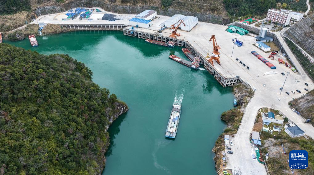 6日、遵義・沙湾港を出港する貨物船。(ドローンから、遵義=新華社記者/陶亮)